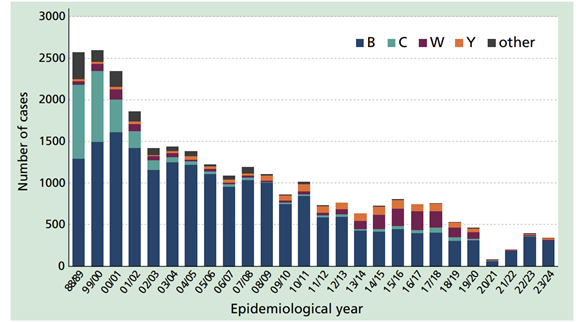Cases of invasive meningococcal disease by epidemiological year, England and Wales 1998-2021. Public sector content available under the Open Government Licence v3.01